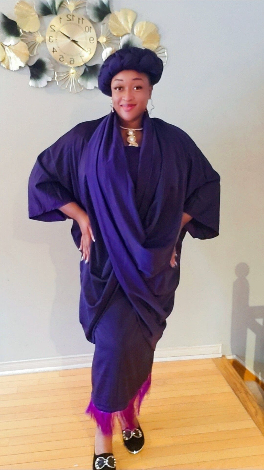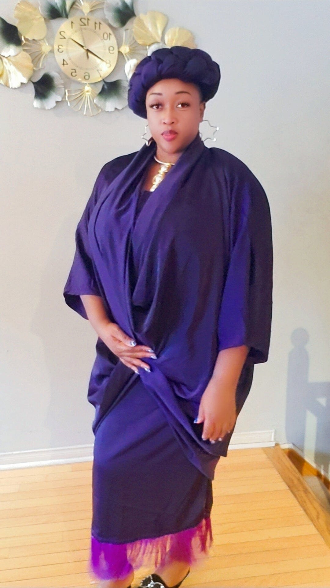 Twopiece. Cowl neck jacket with fitted sleeveless dress . Weave headpiece..Fitted dress is zipper back with fringe at bottom